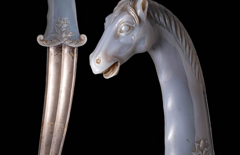 The sale stands out for its diverse collection of Indo-Persian arms and armour, including lot 63, a fine Mughal dagger of exceptional craftmanship with a hilt carved from a single piece of translucent agate in the form of a rearing horse’s head with flaring nostrils, detailed mane, and expressive eyes, and lot 6, a finely worked pair of steel arm guards, or bazu band and lot 67 a rare Mughal riveted chamfron. Following are an array of ceramic styles from lot 116, a beautiful glazed ceramic mihrab tile in white and blue calligraphic detailing and some dazzling pieces of Indian jewellery, lots 56 and 57, two intricate enamelled diamond and multi-gem set rings.